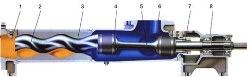 1、出料口穿杠 2、轉(zhuǎn)子3、定子 4、密封套5、中間軸6、進(jìn)料口 7、機(jī)械密封 8、軸承座