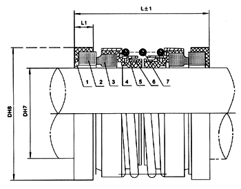 1、靜環(huán)墊 2、靜環(huán) 3、動(dòng)環(huán) 4、波紋管 5、傳動(dòng)套 6、緊圈 7、彈簧